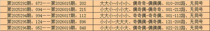 排列三第2026015期-第2026019期连续5期奖号为:202-215-112-896-848。