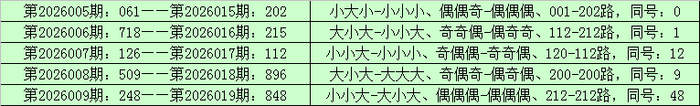 统计排列三已开出的奖号发现,在连续5期(第2026005期-第2026009)奖号为:061-718-126-509-248。